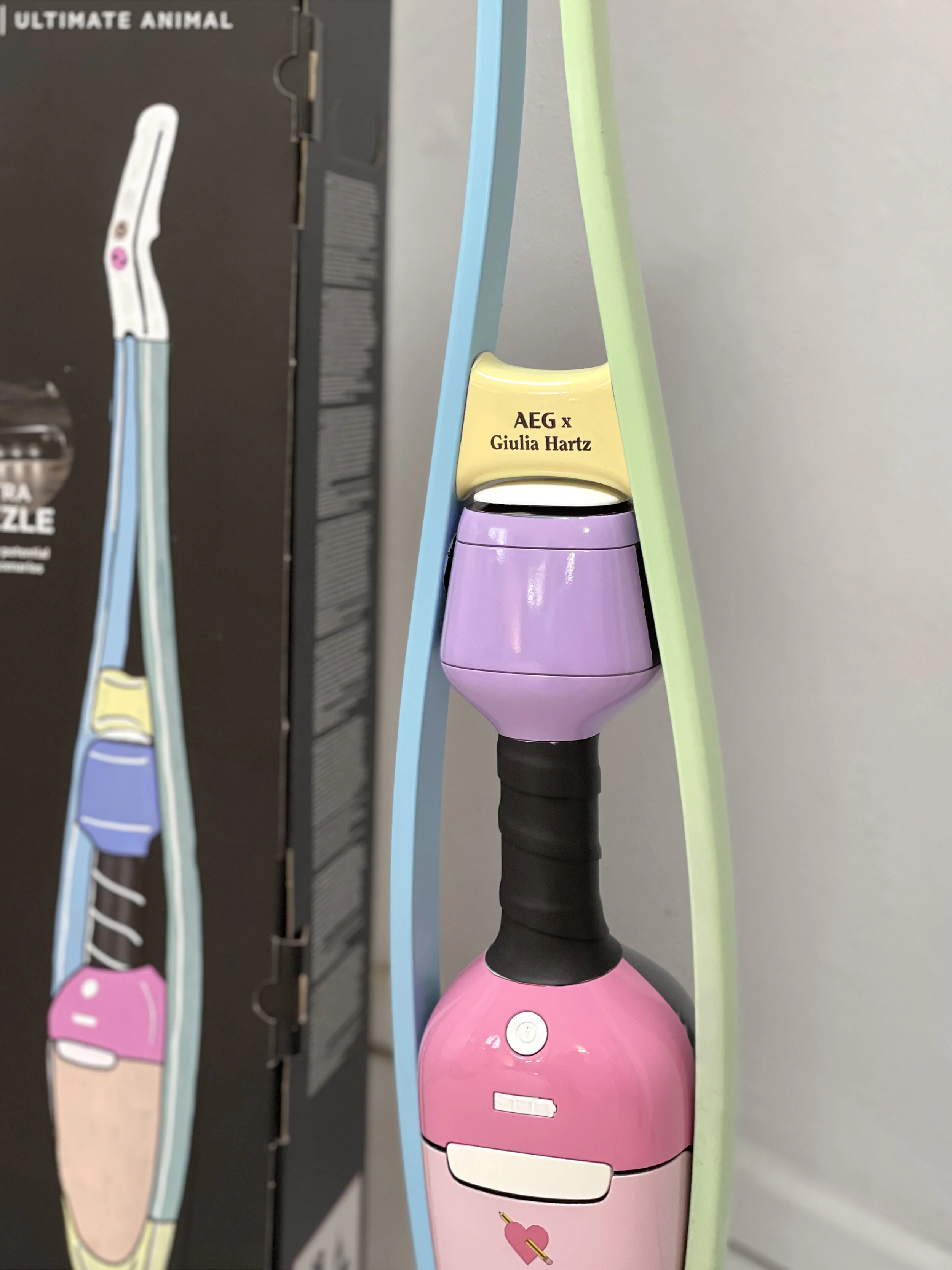 I hand-painted a unique design onto the vacuum cleaner, using the bold colors and playful elements that usually exist in my digital illustrations. To make the customization even more immersive, I created custom taglines that were applied to its accessories, making the entire piece feel like an extension of my artistic universe. The final result was more than just a decorated appliance: it was a functional, high-quality object that felt fun, interactive, and meaningful in everyday life. Alongside the artwork, I contributed to the larger social media campaign by creating a reel and photo content, helping bring the concept of visible, design-forward appliances to a mine and the brand’s audience in the DACH area.
