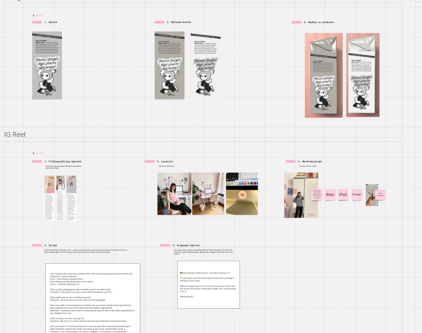 I imagined Oatly having a mascot named OatLee, a sassy and empowered character sharing a message of self-love with the phrase “Never forget that you’re Oat-some.” I created a reel showcasing my creative process, from the initial design draft to the final content. Along with the video, I shot a picture for cover and crafter the caption. I guided the client through every step, from scripting to execution on a Miro board where we could interact digitally, leave feeedback and iterate quickly and openly. The final piece was shared on Instagram, bringing my vision to life in an engaging and playful way.