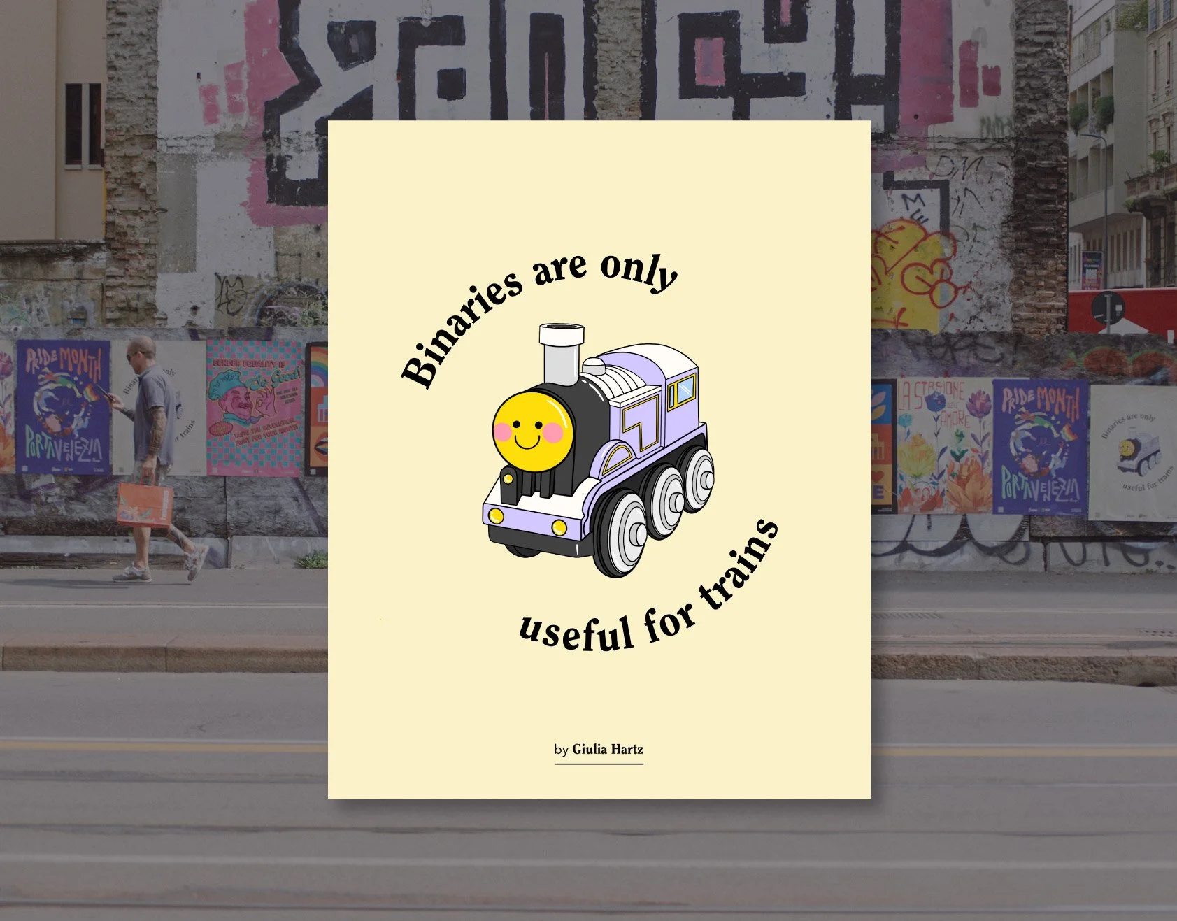 I designed my artwork to celebrate Non-Binary Day and felt like it was matching very much the the exhibition theme. Perhaps, I've found really tempting to build a visual based on trains when the Italian Secretary of State for Transport has such conservatives ideas on inclusivity.